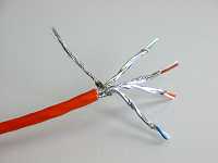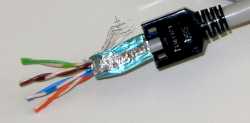 Das Kabel wird zuerst abisoliert. Hier sehen Sie eine Kabelvariante, bei der die Adernpaare nochmals einzeln abgeschirmt sind. Die Abschirmung des Kabels und die der Adern wird nur soweit wie nötig zurückgeschlagen. Dann werden die Adern entsprechend der Farbmarkierung in die Schlitze der Leiste eingelegt. Man kann entweder erst alle Kabel auflegen und dann die Verbindung herstellen oder man bearbeitet Paar für Paar.