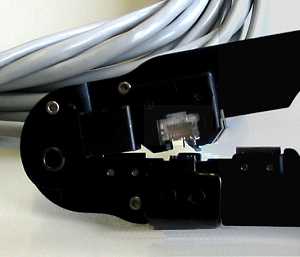 Der Stecker wird vorsichtig in die Crimpzange eingeführt (er paßt nur in einer Richtung) und bis zum Anschlag hineingeschoben. Jetzt pressen Sie die Crimpzange einmal kräftig zusammen (soweit es geht), lösen sie wieder und ziehen den Stecker heraus. Beim nicht-abgeschirmten Stecker schieben Sie noch die Knickschutzhülle auf den Stecker.