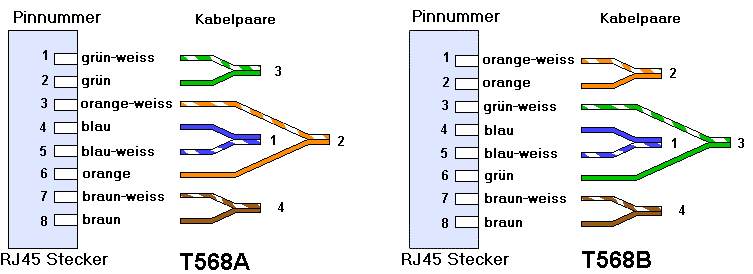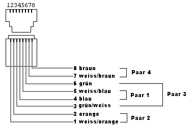 Hier gibt es zwei Belegungen (die aber bis auf die Farben zum gleichen Ergebnis führen). Man muß sich nur an einen der beiden Standards halten, damit man nicht durcheinander gerät. Normales 100BaseT- und 10BaseT-Kabel kommt mit den Adern an den Pins 1, 2, 3 und 6 aus. Die Pins 4, 5, 7 und 8 werden für 100BaseT4+ benötigt.