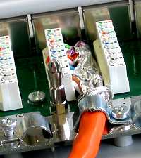 Sind alle Adern korrekt aufgelegt, wird das Abschirmnetz zurückgezogen, zusammen mit dem Kabel unter die Zugentlastungs-Schelle gelegt und festgeklemmt. Die Schellen sind jeweils für ein Kabelpaar, so daß man normalerweise erst noch das zweite Kabel auflegt, bevor die Schraube der Schelle festgezogen wird.