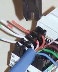 Halten Sie die Kabel etwa 10 mm von der Isolierung entfernt parallel fest und schneiden Sie alle Adern ca. 4 mm vor den Fingern ab. Ab da sollten Sie die Adern weiter festhalten. Die Länge der freiliegenden isolierten Adern muß zwischen 10 mm und 14 mm liegen. Manche Steckertypen haben einen kleinen, rechteckigen Plastikschlitten als Montagehilfe beiliegen. In diesem Fall werden die Kabel zuerst in den Schlitten eingeschoben und danach abgeschnitten. Der Schlitten hat einen Nachteil: Manchmal kann man nicht erkennen, ob er tief genug im Stecker sitzt (dann gibt es keinen Kontakt beim abschließenden Crimpen). Wenn man den Plastikschlitten mit schwarzem Filzer am Rand einfärbt, kann man seine Lage leichter erkennen und sie gegebenenfalls korrigieren, indem man ihn mit Pinzette oder Schraubendreher tiefer in den Stecker schiebt.