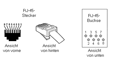 Anschlußbelegung der Twisted-Pair-Stecker für Hub und Computer