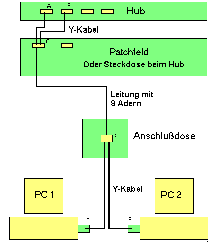 An Ihrem Hub belegen Sie zwei Ports, die dann per Y-Kabel auf ein Kabel geleitet werden, das zu einem Verteilungspunkt (Dose im Büro) verlegt ist. Von dort wird mit einem weiteren Y-Kabel zu Ihren Endgeräten verteilen.