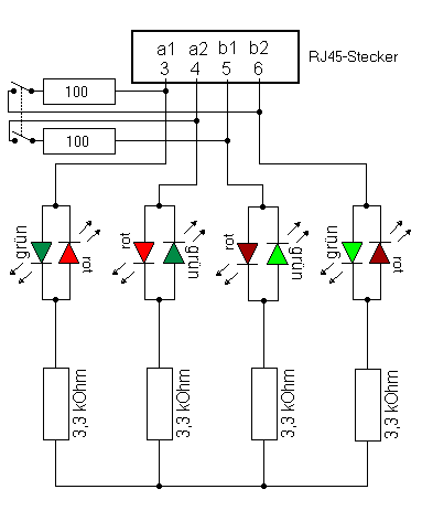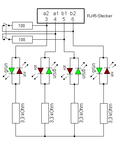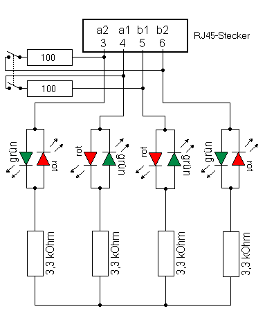 Die LEDs und Vorwiderstände werden auf einer Lochrasterplatine aufgebaut und mittels eines kurzen Kabels mit dem RJ45-Stecker verbunden. Zusätzlich kann man noch Abschlußwiderstände auf der Platine unterbringen, die jedoch abschaltbar sein müssen.