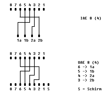 Neben der IAE-Dose wird auch noch die oben erwähnte UAE-Dose (UAE="Universal-Anschluß-Einheit") für digitale und analoge Wählanschlüsse sowie Netzwerke verwendet. Durch Einsatz von kleinen Kunststoffklötzchen, sogenannten Anpassungselementen, kann die UAE auch 6polige Westernstecker aufnehmen. Die Beschaltung der UAE ist jedoch anders. Beachtet man die Belegung der Anschlußklemmen, kann auch die UAE für ISDN verwendet werden. Das folgende Bild zeigt die unterschiedliche Belegung beider Dosen.