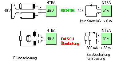 | Fehler beim Anschluss der Abschlusswiderstände (Schaltung zwischen Strang 1 und 2) | Überlastung der Busspeisung mit 32 W, In der Regel schaltet das NT die Speisung ab, dennochVorsicht! Widerstände können sehr heiß werden, Brandgefahr. |