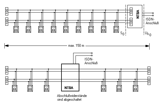 Der NTBA kann aber auch in der Mitte des Systems eingeschleift werden. Die Widerstände im NTBA werden abgeschaltet und es müssen in diesem Fall jedoch an beiden End-IAE-Dosen Abschlußwiderstände eingebaut werden.