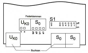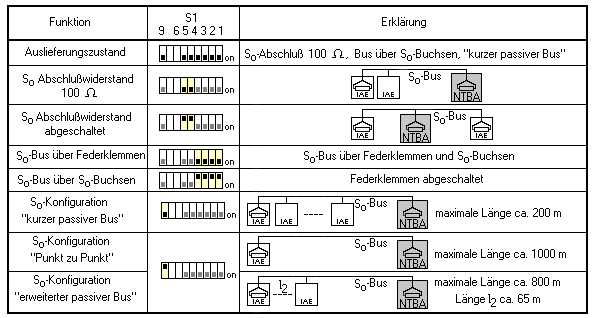 Rechts über den S0-Buchsen befindet sich der DIP-Schalter S1, mit dem die Buseigenschaften eingestellt werden können. Die folgende Grafik zeigt, welche Einstellmöglichkeiten geboten werden.
