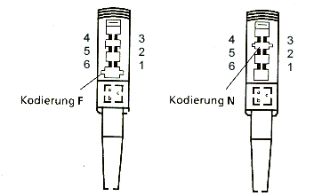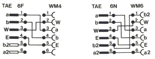 Im übrigen macht TAE alles viel einfacher. Jede Dose hat Zuleitungen und Ausgangsleitungen, so daß sich mehrere Dosen hintereinanderschalten lassen (z. B. im Flur, Wohnzimmer und Schlafzimmer). Beim Einstecken des TAE-Steckers wird die Verbindung zu nachfolgenden Dosen unterbrochen, Mithören ist also ausgeschlossen. Die TAE-Dosen und -Stecker gibt es mit zwei Codierungen, F für Fernsprecher und N für alle anderen Endeinrichtungen (Modem, usw.). Neben der Einfachdose gibt es auch Mehrfachdosen. Die Stecker sind durch Nuten unterschiedlich codiert, damit keine Verwechselungen entstehen können. Von den sechs Polen des TAE-F-Steckers sind nur vier beschaltet.