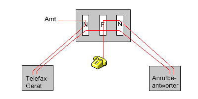Die N+F+N-Dose ist intern so verschaltet, daß alle Geräte hintereinanderliegen, wobei das Telefon das letzte Glied der Kette ist. Wird ein Stecker eingesteckt, trennt er zwei interne Kontakte, die sonst die Signale zur folgenden Dose durchschalten. In den Modems steckt ein Relais, das die Verbindung zum Telefon durchschaltet, wenn das Gerät sich in Ruhe befindet. Erst bei Aktivierung schaltet sich das Gerät auf die Leitung. Wird der Stecker eines Endgeräts herausgezogen, sorgen die Kontakte in der Dose für die Verbindung. Die Beschaltung der Klemmen ist: