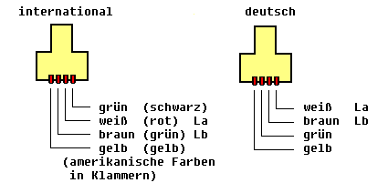 Mit dem Western-Modular-Stecker, mit dem das Kabel am Gerät befestigt ist (das ist der kleine Plastikknubbel mit den vier parallelen Kontakten), gibt es eventuell auch Probleme. Bei den Geräten nach internationaler Norm unterscheidet sich die Belegung von den in Deutschland zugelassenenen (Kabelfarben wie oben):