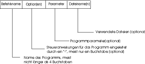 Fast jedem Kommando kann eine Liste von Dateien mitgegeben werden, auf die das Kommando dann angewendet wird. Fehlt die Dateiliste, wird in der Regel die Standardeingabe - normalerweise die Tastatur - als Eingabedatei verwendet. Wie spater noch genauer gezeigt wird, verwendet Unix die Jokerzeichen (Wildcards) Stern (*) und Fragezeichen (?), um beliebige Zeichen innerhalb eines Dateinamens zu kennzeichnen. DOS und Windows haben diese Methode übernommen. Im Gegensatz zu DOS und Windows werden diese Wildcards jedoch nicht vom Programm, sondern von der Shell zu Dateinamen expandiert. Deshalb "sieht" jedes Unix-Programm nur eine mehr oder weniger lange Dateiliste.