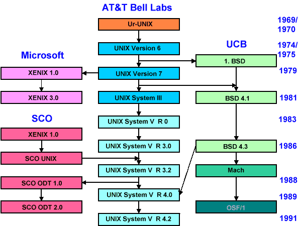 Da das 1956 erlassene Consent Decree AT&T kommerzielle Aktivitäten außerhalb des Telefonmarktes verbietet, gibt die Firma Unix-Quellen und -Binaries zum geringen Preis an Universitäten ab. 1977 veröffentlicht der Student Bill Joy die Berkeley-Erweiterungen als Berkeley Software Distribution (BSD), 1978 folgt 2BSD und der legendäre Editor "vi". 3BSD und 4BSD werden zur Grundlage für die Entwicklung von TCP/IP - und damit des Internets. Die für Universitäten erschwinglichen PDP-Nachfolgerechner VAX und das darauf portierte 4.xBSD steigern die Verbreitung. Im Lauf der Zeit sind zwei Entwicklungszweige entstanden, da Unix sowohl bei Bell Labs (AT&T) als auch an der Universität von Berkley weiterentwickelt wurde: "BSD" und "System V". Kommerzielle Unix-Versionen von Sun (SunOS/Solaris), DEC (Ultrix) und andere folgen.
