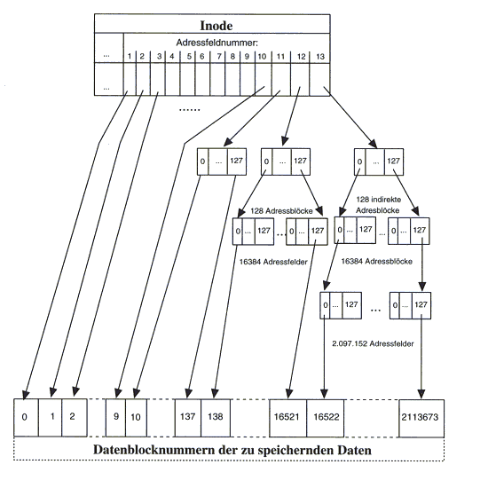 Eine Datei mit bis zu 10 Plattenblöcken (Blockgröße 512 oder 1024 Bytes) kann also direkt angesprochen werden. Größere Dateien haben zusätzlich einen Verweis (einfach indirekt) auf einen Datenblock, der seinerseits 128 Verweisfelder enthält. Reicht das noch nicht, wird zweimal (128 Blöcke mit je 128 Verweisen) oder dreimal indiziert (Dateigröße bis 2 GByte bei 512-Byte-Blöcken, bis 16 GByte bei 1KByte-Blöcken).