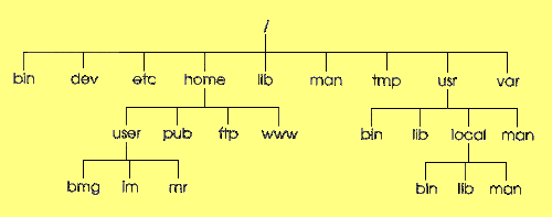 Unix arbeitet mit einem Filesystem, das auf den ersten Blick dem von DOS sehr ähnlich ist (nur auf den ersten). Also gibt es eine Baumstruktur von verschiedenen Verzeichnissen (Directories), in der sich jede Datei irgendwo befindet. Beachten Sie aber, daß ein Directory beim Anzeigen zunächst genauso aussieht, wie eine Datei!. Die einzelnen Verzeichnisnamen werden durch normale Schrägstriche ('/') getrennt, NICHT durch Backslashes ('\') wie bei DOS/Windows!