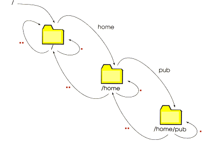 Eine besondere Erwähnung verdienen die beiden Verzeichnis-Einträge "." und "..". Das sind Stellvertreter für Verzeichnisnamen, die man statt der realen Namen (abkürzend) benutzen kann. Und zwar bezeichnet "." das jeweils aktuelle Verzeichnis, und ".." das dem aktuellen Verzeichnis übergeordnete Verzeichnis.