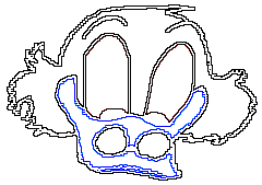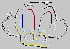 Die einfachen Filterfunktionen wurden weiter oben schon behandelt. Daneben besitzen viele Malprogramme sogenannte 'Deformationsfilter', mit denen das Bild verzerrt werden kann. Im linken Bild unten wurde der Kopf auf eine Kugel abgebildet. Im rechten Bild wirden zunächst mit der Kantensuche ('Find Edges') die Umrisse ermittelt. Da das Ergebnis farbige Linien auf schwarzem Hintergrund liefert, wurde mit der 'Negativ'-Funktion das Bild umgekehrt und in Komplementärfarben umgewandelt.