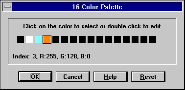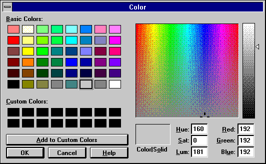 Ein Doppelklick auf die gewnschte Farbe liefert das Palettenfenster. Hier kann man aus den Standard-Windows-Farben durch Anklicken wählen (links) oder eine individuelle Farbe entwerfen (rechts). Normalerweise wird man zuerst eine Standardfarbe links anklicken und dann rechts Modifikationen vornehmen.