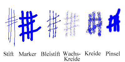Die meisten Malprogramme kennen verschiedene Stift-Typen, die unterschiedliche Effekte auf dem Maluntergrund hervorbringen. Grundsäzlich sollte man bei allen Retuschen die 24-Bit-Farbtiefe wählen, da sonst einige Effekte nicht besonders gut wirken. Gegebenenfalls muß man die Farbtiefe vor der Bearbeitung erhöhen. Die Stift-Wekzeuge haben jeweils verschiedene Parameter, mit denen sich Dicke, Form und Deckungskraft einstellen lassen.