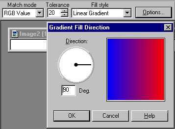 Als erstes wird ein einfacher horizontaler Verlauf erzeugt. Der Farbverlauf wird dabei immer zwischen den eingestellten Farben für Vorder- und Hintergrund erzeugt. In den folgenden Beispielen wurde blau für den Vordergrund und rot für den Hintergrund verwendet. Es wird im Kontextmenü für das Füllwerkzeug "linearer Gradient" gewählt und als Richtung ein WInkel von 90 Grad eingestellt. Das Vorschaubild zeigt den Verlauf.