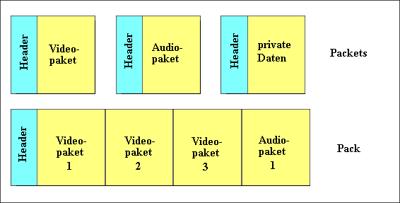 Diese Daten werden von den Kompressionsschichten für Video und Audio codiert und zur Übertragung in die Päckchen eingefügt.