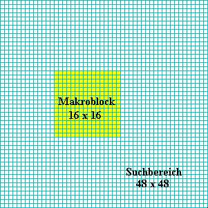 Ein denkbares Entscheidungskriterium ist zum Beispiel der mittlere quadratische Abstand der Werte der beiden 16 x l6-Pixelblöcke. Gemeint ist damit, daß die Quadrate der Differenzen aller Luminanzwerte und Chrominanzwerte des Originalblocks und des Kandidatenblocks innerhalb des Suchbereiches errechnet und aufsummiert werden. Auf diese Art und Weise erhält man ein Maß für die Ähnlichkeit zweier Blöcke. Hat sich ein Block zum nächsten fortgepflanzt ohne sich zu verändern, ist die Differenz gleich Null. Eine sehr rechenaufwendige Methode wäre, für alle denkbaren Verschiebungen innerhalb des Suchbereichs die Summe der quadrierten Differenzen zu bilden. Im Encoder wird dann der Bewegungsvektor des Bildes mit dem kleinsten quadratischen Abstand zum Original als der beste ausgewählt. Die Suche nach dem besten Motion-Vektor kann mit einer Auflösung von 1 oder 1/2 Pixel erfolgen. Die für die Codierung verwendeten Vektoren besitzen dabei eine Auflösung von bis zu einem halben Pixel. Für die Suche nach dem Motion-Vektor kann linear zwischen benachbarten Pixeln interpoliert werden. Da der Rechenaufwand sehr groß ist, werden unterschiedliche Suchstrategien angewandt. So kann beispielsweise zunächst das Gitter der 48 x 48 ganzzahligen Verschiebungen abgesucht werden, um danach die acht benachbarten Positionen zu untersuchen.