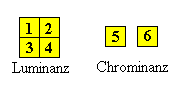 | Block-Layer | Auf dieser Ebene wird ein Block von 8 x 8 Pixeln mit Original- bzw. Fehlerbildinformation in Form von quantisierten und Huffman-codierten DCT-Koeffizienten dargestellt (siehe auch JPEG). Der in den DCT-Matrizen am unmittelbarsten ins Auge fallende Unterschied zwischen Original- und Fehlerbildern ist das Vorzeichen der Luminanzwerte und der Chrominanzwerte. Während diese Werte im Original stets positiv sind, ergeben sich bei der Differenzbildung positive und negative Werte. Die Differenzwerte werden in einer anderen Art und Weise quantisiert, da die psychovisuellen Gewichtsfunktionen für die Differenzen zweier realer Bilder keine augenfällige Bedeutung haben. Für die Fehlerbilder wird eine Quantisierungskennlinie verwendet, die um den Nullwert herum in einem doppelt so breiten Intervall wie an allen anderen Stellen den Wert Null erzeugt. Das bedeutet in der Praxis, daß der Encoder bei nur geringen Unterschieden von Helligkeit und Farbsättigung keinen Unterschied codiert. |
