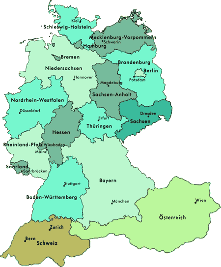 <IMG SRC="de_map.gif" WIDTH=450 HEIGHT=543 BORDER=0 ISMAP USEMAP=#germany></A> <MAP NAME="germany"> <AREA SHAPE="POLY" COORDS="65,445,73,449,75,447,78,447,80,450,84,449,88,447,91,445,94,446,96,448,98,448,101,447,98,445,97,442,99,439,102,436,106,434,111,435,114,438,115,439,118,440,121,438,123,438,130,442,132,440,136,442,142,443,144,441,154,448,157,442,161,444,164,442,168,443,167,439,165,437,167,435,166,432,166,427,168,419,161,401,167,394,169,395,174,390,174,386,172,382,174,381,177,382,180,381,178,378,179,368,175,362,173,362,170,357,171,355,166,351,165,340,167,339,165,333,163,336,158,336,158,330,155,331,154,330,155,326,152,323,148,324,147,318,137,319,140,321,140,326,135,326,133,331,132,331,129,331,129,334,126,334,122,335,118,341,115,341,115,334,111,334,110,327,109,328,109,332,106,334,102,330,103,338,105,339,104,343,103,345,105,346,101,350,99,358,96,366,92,367,89,373,88,376,83,379,83,382,77,389,76,394,74,398,72,399,72,396,69,396,69,398,59,399,57,395,53,396,53,408,72,405,71,412,67,417,67,421,69,427,67,430,65,445" HREF="baden_wuerttemberg.html" ALT="Baden-Würtenberg"> <AREA SHAPE="POLY" COORDS="157,447,177,462,181,456,181,447,202,450,209,457,231,444,251,442,250,439,255,434,276,439,285,450,287,439,279,438,282,427,271,413,288,399,293,399,298,395,299,386,304,381,312,385,314,380,312,373,313,371,310,367,308,367,304,362,298,363,278,342,271,341,268,338,254,316,259,306,239,283,235,278,220,281,213,274,212,276,211,287,208,288,205,286,203,283,199,283,195,281,191,283,196,286,194,290,191,291,189,293,183,292,182,284,167,272,158,280,153,281,153,288,146,292,143,292,144,300,138,300,135,297,126,299,127,298,126,306,130,318,128,328,134,325,137,322,134,320,134,316,150,315,149,320,154,318,161,334,165,327,170,353,182,367,184,383,177,386,177,393,170,398,166,397,164,401,170,418,169,436,170,446,157,447" HREF="bayern.html" ALT="Bayern"> <AREA SHAPE="POLY" COORDS="150,90,154,97,158,97,161,94,166,98,169,97,163,91,165,85,163,81,150,90" HREF="hamburg.html" ALT="Hamburg"> <AREA SHAPE="POLY" COORDS="82,304,94,299,103,318,100,324,106,330,107,325,112,325,113,331,117,332,117,338,120,332,125,331,125,322,126,319,121,300,121,297,130,294,139,295,141,297,141,288,147,288,151,283,151,277,157,278,162,272,162,265,156,267,159,253,161,251,157,248,163,242,167,242,164,238,168,233,158,226,156,220,152,222,153,226,150,227,143,224,143,221,145,218,143,214,147,209,144,207,140,207,138,210,134,215,126,219,125,215,120,215,122,220,120,222,115,223,112,222,108,228,113,226,115,232,113,238,106,239,107,244,99,254,96,253,91,257,93,261,90,264,92,272,88,272,86,274,86,278,91,287,86,291,87,296,87,298,79,298,78,300,82,304" HREF="hessen.html" ALT="Hessen"> <AREA SHAPE="POLY" COORDS="63,84,72,84,86,82,91,92,87,94,90,100,97,101,100,94,98,88,110,98,106,82,111,71,120,76,131,73,144,91,150,94,157,101,161,98,167,101,170,99,180,104,182,102,188,107,193,104,206,121,214,120,211,126,206,129,198,127,194,128,192,131,186,131,186,136,192,147,193,155,197,161,194,161,198,169,195,171,197,175,193,178,182,179,179,183,183,190,180,193,184,204,183,208,176,207,173,207,159,219,152,217,149,221,147,222,148,215,150,209,145,204,138,203,140,198,141,192,134,185,128,175,124,165,129,161,128,152,124,154,120,158,113,159,113,151,101,153,96,157,97,162,101,163,101,172,102,174,99,175,95,174,92,178,84,179,89,175,84,170,87,163,83,159,77,159,72,153,69,157,69,160,59,166,52,166,54,160,50,154,40,153,42,145,53,146,55,131,61,121,62,103,52,103,54,92,57,94,58,91,38,89,37,86,50,80,87,74,103,64,108,68,101,77,84,78,63,82,63,84" HREF="niedersachsen.html" ALT="Niedersachsen"> <AREA SHAPE="POLY" COORDS="147,450,153,453,155,450,167,458,167,463,172,461,170,468,176,467,184,458,185,452,193,451,196,454,199,452,204,460,217,459,223,452,229,452,232,447,239,448,241,446,253,446,253,440,257,441,261,440,265,444,273,440,277,443,276,446,285,453,289,450,289,445,291,439,287,435,283,435,286,427,275,413,289,402,296,402,302,396,302,385,313,388,316,383,324,386,341,382,354,361,359,360,366,364,369,363,389,375,409,377,418,372,423,374,426,372,424,377,425,395,425,399,430,404,439,415,446,416,447,421,436,430,425,433,426,454,422,460,423,468,419,473,420,476,413,482,398,482,393,488,377,491,371,497,367,496,362,503,358,503,352,509,345,511,337,512,332,507,323,509,314,503,305,505,292,499,283,505,278,500,265,494,266,486,257,480,254,473,235,477,232,473,221,473,213,480,180,485,169,486,155,475,146,478,142,473,144,464,146,461,145,458,147,450" HREF="osterreich.html" ALT="Österreich"> <AREA SHAPE="POLY" COORDS="64,448,69,452,75,452,77,450,77,452,86,452,92,448,98,452,104,449,107,445,105,444,101,443,104,439,108,438,110,440,110,442,113,445,116,443,117,446,124,444,124,441,129,446,134,443,136,446,142,445,144,449,142,457,144,463,138,471,140,478,148,480,153,479,162,485,166,489,179,488,181,502,172,507,173,510,164,517,152,519,144,521,137,517,134,518,129,526,128,531,129,537,123,541,118,536,109,528,98,520,94,522,80,535,65,536,46,539,38,535,38,531,32,526,30,520,28,518,22,520,20,515,15,515,10,524,4,521,7,515,19,505,23,499,25,491,28,486,28,481,37,470,43,461,47,461,50,455,60,454,64,448" HREF="schweiz.html" ALT="Schweiz"> <AREA SHAPE="POLY" COORDS="59,351,65,352,66,357,73,359,82,359,92,364,98,351,101,346,102,339,97,323,100,317,92,303,81,306,73,299,78,296,86,297,85,292,81,290,88,285,82,277,85,269,89,269,88,263,84,261,82,254,77,248,77,253,73,258,62,262,61,266,52,268,44,271,43,276,40,276,38,274,40,282,34,283,30,281,21,285,15,289,6,289,5,298,13,297,15,305,20,310,26,312,28,313,27,321,21,328,29,330,45,323,57,328,58,336,58,340,62,344,73,344,97,344,96,351,59,351" HREF="rheinland_pfalz.html" ALT="Rheinland-Pfatz"> <AREA SHAPE="POLY" COORDS="22,331,30,333,45,326,55,331,56,334,57,342,59,344,96,344,95,349,55,350,57,354,48,355,42,349,38,349,36,353,28,343,10,343,11,333,22,331" HREF="saarland.html" ALT="Saarland"> <AREA SHAPE="POLY" COORDS="52,170,62,168,73,158,84,164,82,174,85,176,81,180,86,183,104,177,108,172,101,159,110,153,111,162,122,161,125,155,125,161,119,167,124,178,138,195,136,207,128,216,123,212,118,214,119,220,110,221,105,226,107,231,111,229,111,235,103,237,103,243,99,250,94