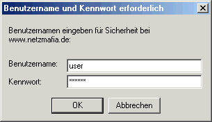 Dadurch wird verhindert, dass ein Verzeichnis (und alle seine Unterverzeichnisse) der Website allgemein zugänglich ist, indem der Zugang nur durch die Eingabe eines Usernamens und des zugehörigem Paßworts gewährt wird.