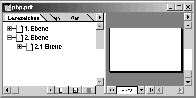 Mit pdf_add_bookmark() fügt man innerhalb eines PDF-Dokuments (PDF-Dokument) ein Lesezeichen (Text) für die aktuelle Seite hinzu. Das Lesezeichen funktioniert, ähnlich wie ein Eintrag im Inhaltsverzeichnis, als Sprungmarke zu einer bestimmten Seite. Rückgabewert der Funktion ist die ID des neuen Lesezeichens. Sie können Lesezeichen hierarchisch sortieren. Jeder neuen Hauptgruppe (Mutter) können Sie weitere Untergruppen zuordnen, welche wiederum eigene Untergruppen besitzen können. Eine Untergruppe kann so also auch zu einer Hauptgruppe werden und weitere Lesezeichen umfassen. Wenn Sie ein Lesezeichen oder eine neue Untergruppe anlegen wollen, können Sie im Parameter Mutter die ID der übergeordneten Gruppe angeben, zu der das Lesezeichen bzw. die Untergruppe gehören soll. Sie können mit dem optionalen Parameter offen bestimmen, ob das Inhaltsverzeichnis einer bestimmten Gruppe beim Öffnen des PDF-Dokuments aus- oder eingeklappt sein soll. Soll das Inhaltsverzeichnis ausgeklappt sein, so brauchen Sie nur für offen einen Wert ungleich 0 (Null) angeben. Der optionale Parameter offen ist nur im Zusammenhang mit einer Gruppe (Mutter) erlaubt. Da aber die oberste Hauptgruppe (das erste Lesezeichen) keine "Mutter" besitzt, können Sie einfach einen nicht existenten Rückgabewert (im Beispiel $_x) als Gruppen-ID verwenden. Beim Öffnen des unteren Beispiels klappt die Gruppe "2. Ebene" sofort auf, während die "1. Ebene" geschlossen bleibt.
