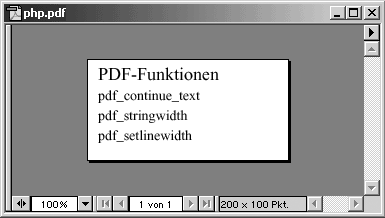 pdf_show_xy ( $dokument, 'PDF-Funktionen', 10, 80 );