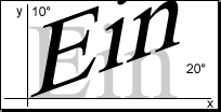 Mit pdf_skew() schert man das Koordinatensystem für alle folgenden PDF-Funktionen in alpha(x)- und beta(y)-Richtung. Dabei sind die Werte für alpha(x) (alpha) und beta(y) (beta) in Grad anzugeben. Wenn Sie Scherwerte größer 0 einstellen, wird sich bei der Textausgabe mit pdf_show_xy() auch der Ursprung des Textes in X- und Y-Richtung verschieben. Beim unteren Beispiel wurde das Koordinatensystem um 20° in X- und 10° in Y-Richtung geschert. Dabei hat sich der Text um den Wert 6 (sechs) zusätzlich auf der horizontalen X-Achse verschoben.