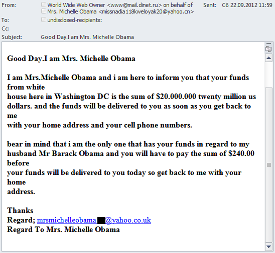 Auch Betrüger machten sich die Popularität von Barack Obama zunutze. Dabei wurde in den betrügerischen Mails nicht nur der Name des amerikanischen Präsidenten missbraucht, sondern auch der seiner Ehefrau Michelle Obama. Indem nigerianische Spammer Mails im Namen der First Lady versendeten, versuchten sie sich das Vertrauen der Anwender zu erschleichen: In der Nachricht verspricht „Michelle Obama“ demjenigen Millionen von US-Dollar, der „ihr“ seine Adresse, Telefonnummer und 240 US-Dollar sendet.