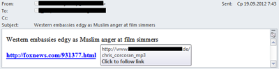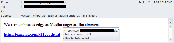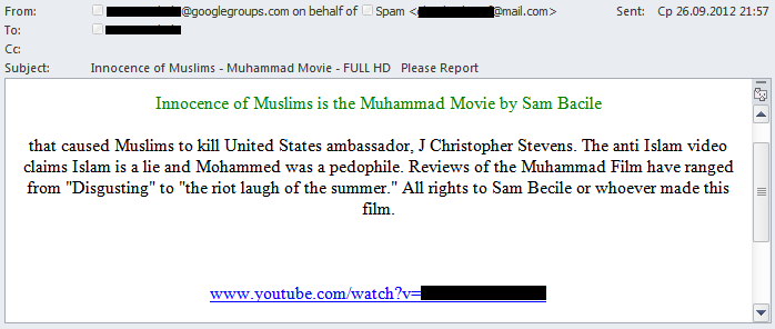 Im dritten Quartal beobachteten wir neben politischem auch religiösen Spam. In den unerwünschten Nachrichten wurden Links auf das skandalumwitterte Video „Die Unschuld der Muslime“ bei YouTube verbreitet. Bemerkenswert dabei ist, dass Cyberkriminelle normalerweise das Interesse der Nutzer an aktuellen Themen ausnutzen und über derartige Spam-Mails Links auf schädliche Ressourcen verbreiten. In diesem Fall führten alle Links jedoch tatsächlich zum YouTube-Video und nicht ein Schadprogramm wurde mit Hilfe dieser Versendung verbreitet.