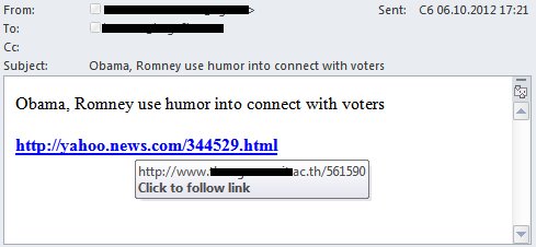 Die Links in den Mitteilungen führten auf eine gehackte Webseite mit darauffolgender Weiterleitung auf die schädliche Ressource pillsearnings.nl. Auf dieselbe Ressource führte auch ein Link in einem anderen Teil derselben Versendung, die den Namen des amerikanischen Präsidenten und das Thema Präsidentschaftswahlen verwendete: