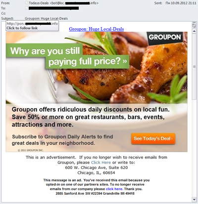 Bereits in unserem Spam-Bericht für das zweite Quartal 2012 waren Coupons ein Thema. Das Auftreten schädlicher Versendungen, die als Benachrichtigungen des größten Coupon-Services Groupon getarnt waren, zwingt uns, dieses Thema wieder aufzunehmen.