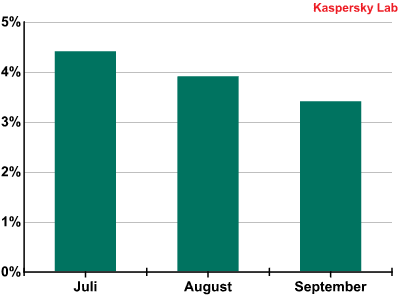 Obwohl der Anteil an schädlichen Anhängen im E-Mail-Traffic im Laufe des gesamten dritten Quartals zurückging, stieg nach den Ergebnissen des Quartals der durchschnittliche prozentuale Anteil an Mails, die schädliche Anhänge enthielten, im Vergleich zum 2 Quartal um 0,9 Prozentpunkte und betrug 3,9 Prozent. Unten stehendes Diagramm zeigt die Verteilung dieses Wertes nach Monaten.
