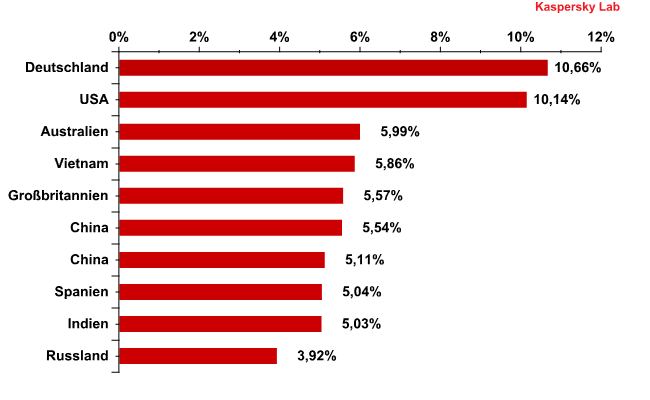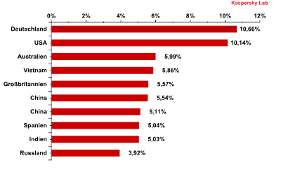 Die bemerkenswerteste Veränderung im Rating der Länder nach Alarmen von Kaspersky Mail-Antivirus ist im dritten Quartal ohne Zweifel der Aufstieg Deutschlands auf den Spitzenplatz – mit einem Zuwachs von 3,8 Prozentpunkten.