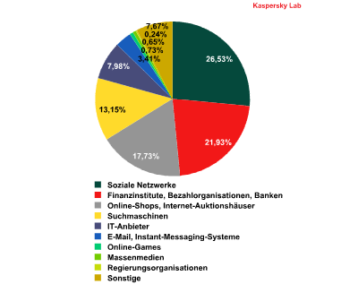 Im dritten Quartal 2012 standen die sozialen Netzwerke an der Spitze der am häufigsten von Phishern angegriffenen Organisationen nach Kategorien. Auf sie entfielen 26,5 Prozent der Attacken, 0,6 Prozentpunkte mehr als im vorangegangenen Quartal. Auf Position zwei befinden sich Finanzorganisationen mit einem Anteil von 22 Prozent aller Phishing-Attacken. Das sind 1,6 Prozentpunkte weniger als im zweiten Quartal.
