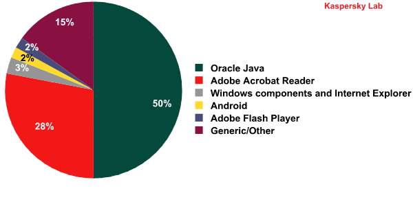 Im Jahr 2012 waren Exploits für Adobe Reader weniger populär – mit ihnen standen 28 Prozent aller Vorfälle in Verbindung. Adobe Reader belegte unter dem Strich den zweiten Platz im Rating. Dabei ist anzumerken, dass sich der Hersteller dem Problem der Sicherheitslücken in den jüngsten Versionen vom Adobe Reader stärker angenommen hat und verschiedene Mechanismen umgesetzt wurden, die die Anwendung vor der Ausführung eines Exploits schützen. Solche Maßnahmen erschweren die Entwicklung effektiver Exploits nachhaltig.