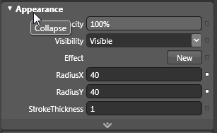 Now look back at the upper left corner of the rectangle you just drew and note the dotted lines. By clicking and dragging these lines, you can visually edit the corner radius of the rectangle. Note that as you drag the dotted lines you can see the values change in the RadiusX and RadiusY textboxes in the Appearance pane. This is where you can enter exact values if necessary. For this example 40 is used for each radius.For a precise amount, you can enter 40 into the RadiusX and RadiusY textfields.