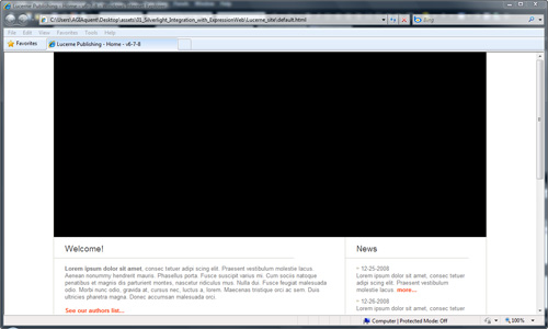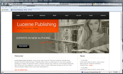 Choose File> Save and then F12 to open the page in the browser, you will now see the animated Silverlight navigation bar as well as the rotating images in the Silverlight slideshow.