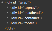 To see the DOM tree in action, click the arrow to the left of the <html> tag to expand it. Then click the arrow to expand the body tag and then the element labeled <div id=”wrap”>. Expanding this element exposes the div elements that compose the structure of your page: topnav, masthead, container and footer.