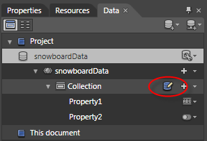 The Define New Sample Data window appears. Type SnowboardData, then press OK. You will see the default collection of data properties in the data window. SketchFlow puts two generic properties in this collection labeled Property1 and Property2. You will now take a look at this sample data.