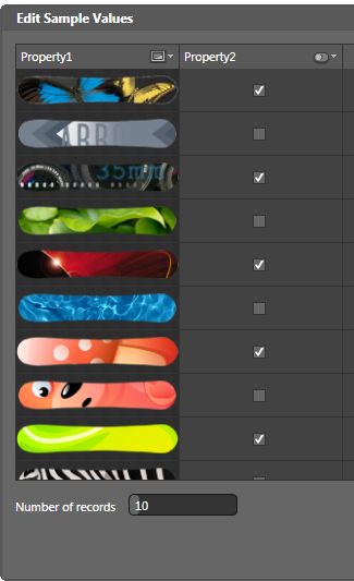The Edit Sample Values window appears. In the first column are the sample text values for Property1 and in the second column are the sample Boolean (True/False) values for Property2.