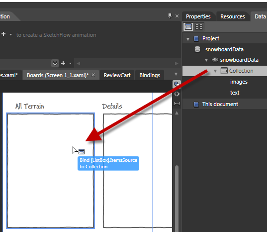 To apply the data to the ListBox, click the Collection and drag it onto the All Terrain ListBox.