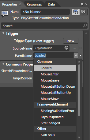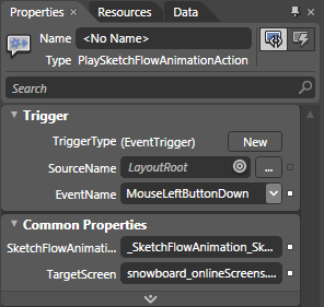 Click on the behavior [PlaySketchFlowAnimationAction] to select it. You will now modify its properties.