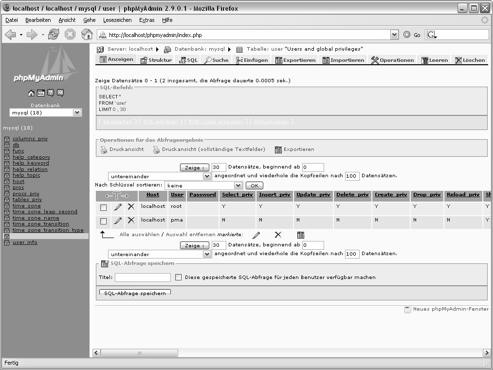 Wählen Sie im linken Navigationsbereich aus dem Listenmenü die Datenbank mysql aus und lassen Sie sich den Inhalt der Tabelle user anzeigen. Die Benutzerliste könnte sich wie Bild 7.2 darstellen.