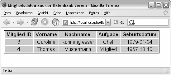 Um eine Ausgabe zu erhalten, werden folgende Datensätze der Datenbanktabelle Mitglieder vorausgesetzt: