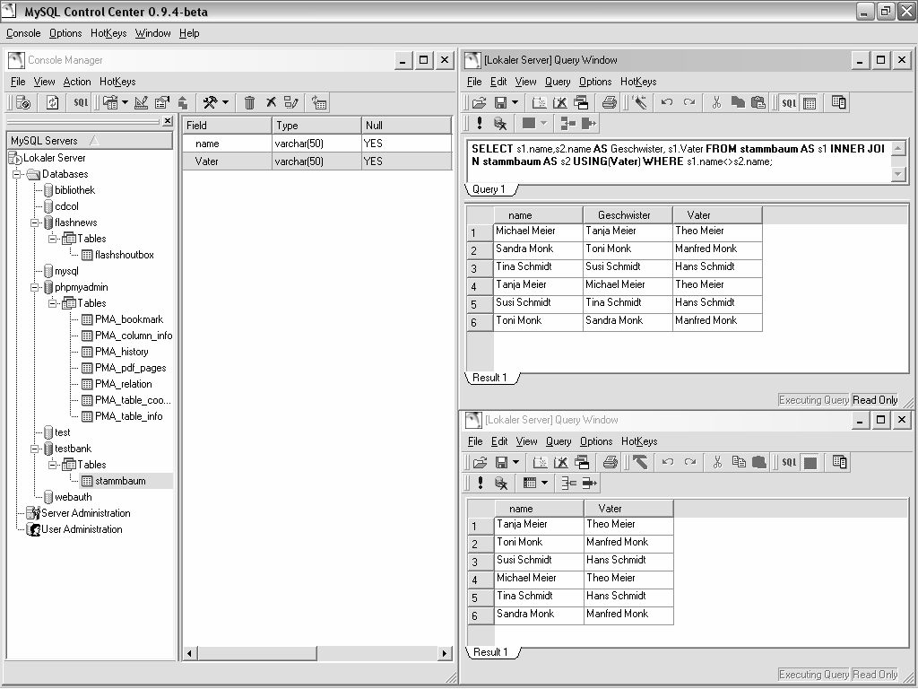 Um jetzt herauszufinden, welche Personen Geschwister sind, kann ein Self Join verwendet werden. Das folgende Beispiel beschreibt dies: